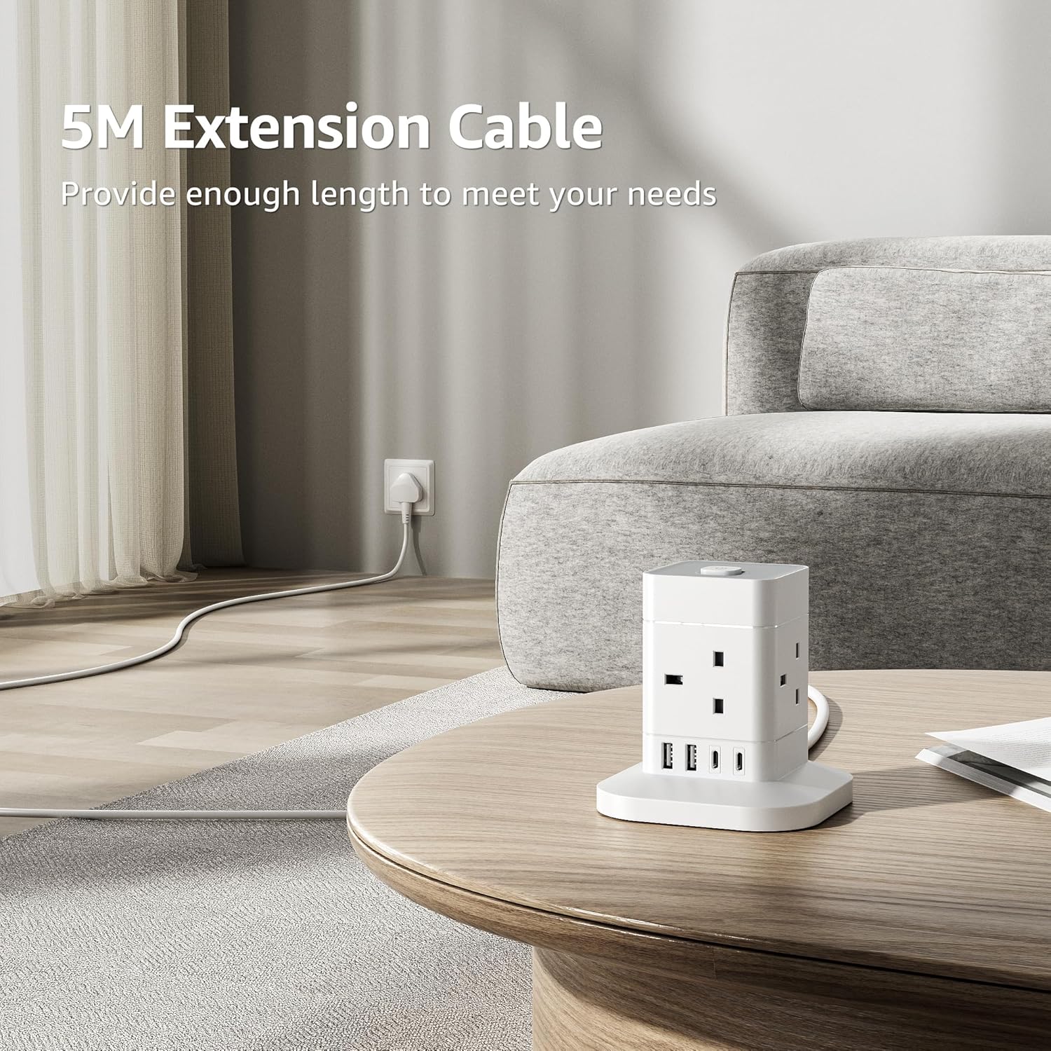 Q4: What is the maximum power rating of this UK tower extension lead?A: The tower power strip is rated at 13A / 250V / 3250W maximum. This makes it suitable for powering multiple high-wattage appliances such as kettles, monitors, PCs, heaters, and gaming consoles at the same time.