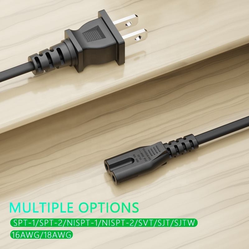 The NEMA 1-15P to IEC C7 power cord is a widely used AC power cable designed for household electronics and office equipment. It features a US standard two-prong plug and a figure-8 IEC C7 connector, providing reliable power connections for various electronic devices.