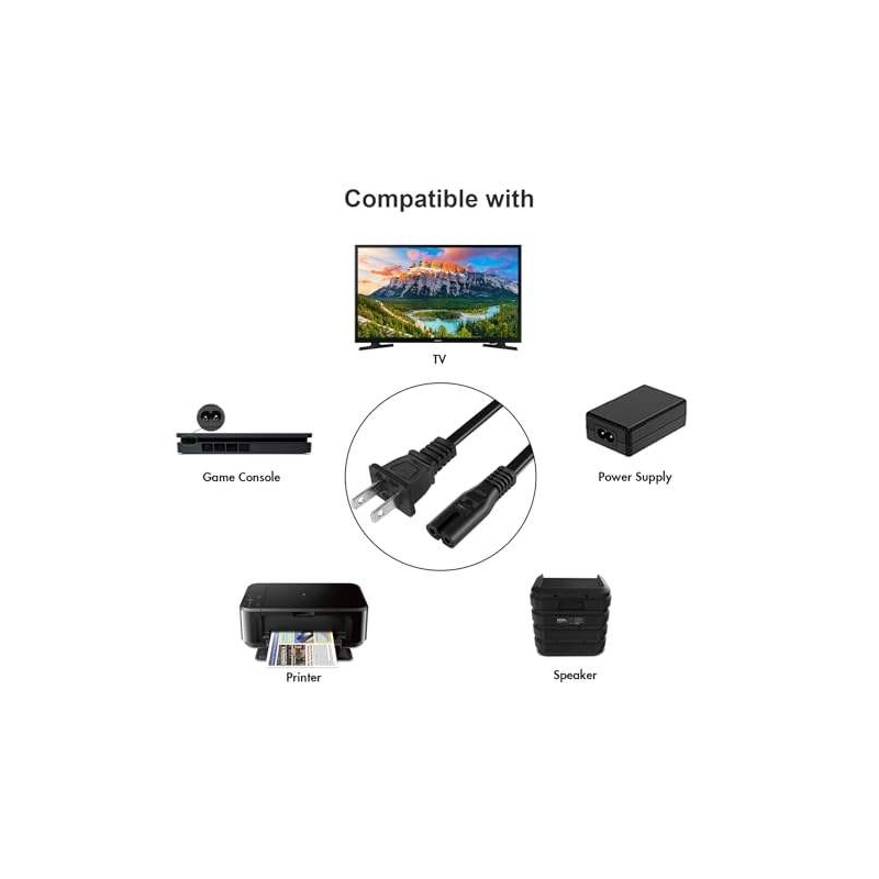 This type of power cord is commonly used for TVs, monitors, speakers, game consoles, laptop adapters and many other small electronic devices.
